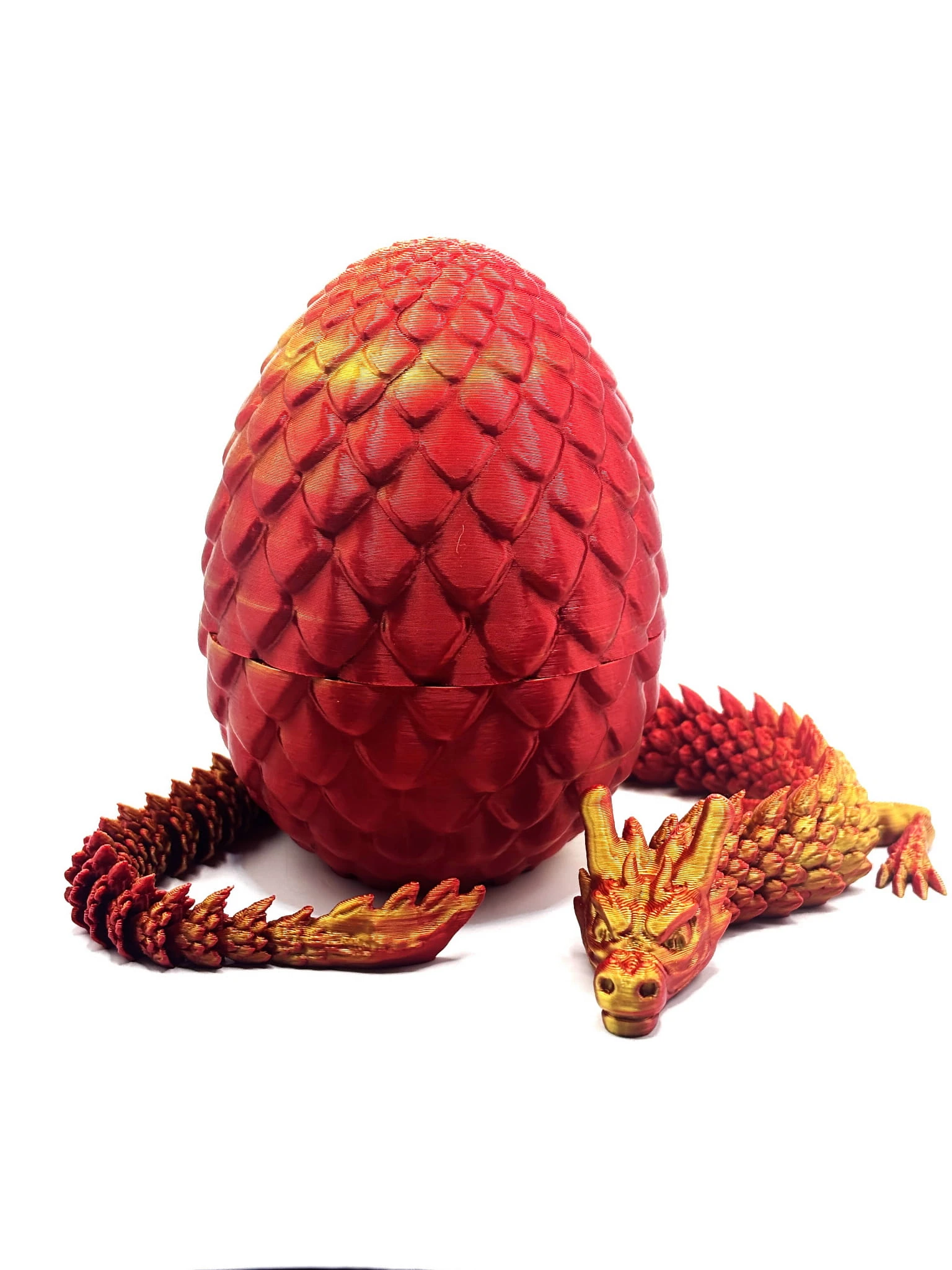 Przedstawiamy naszą wyjątkową figurkę Smocze Jajo ,w którym kryje się ruchomy Smok w kolorze pomarańczowo-czerwonym. Ta niezwykła dekoracja to doskonałe połączenie stylu i kreatywności, idealna do każdego wnętrza. Wykonana w technologii druku 3D, figurka wyróżnia się precyzyjnym wykonaniem i wysoką jakością, co sprawia, że jest zarówno trwała, jak i estetyczna.