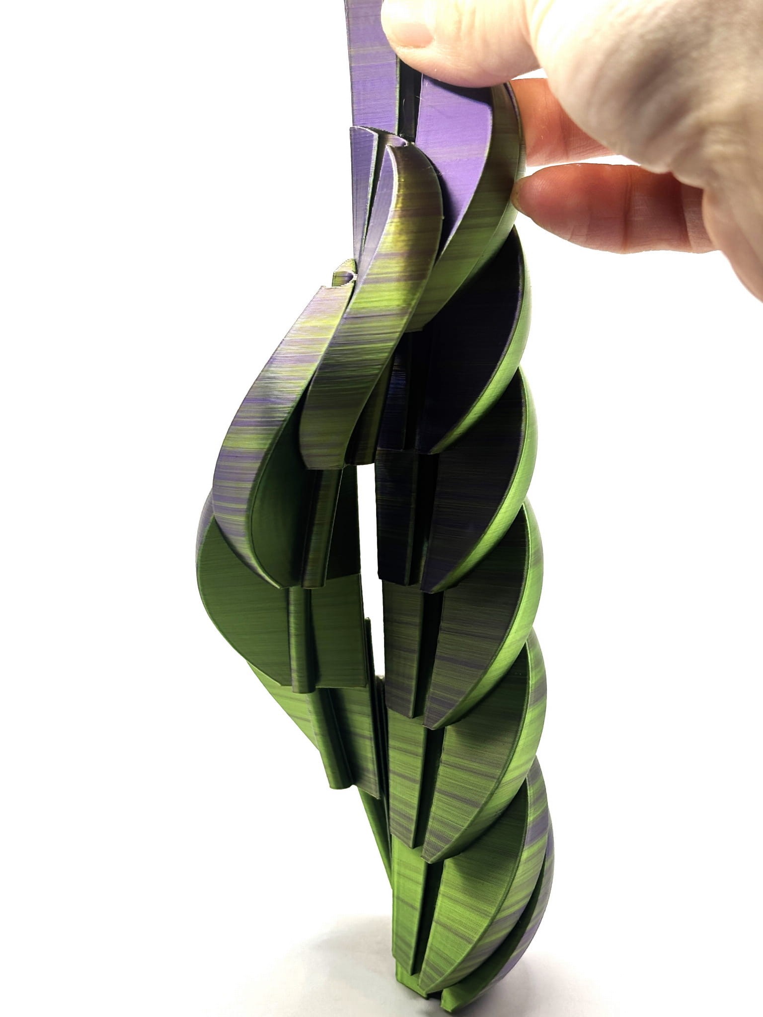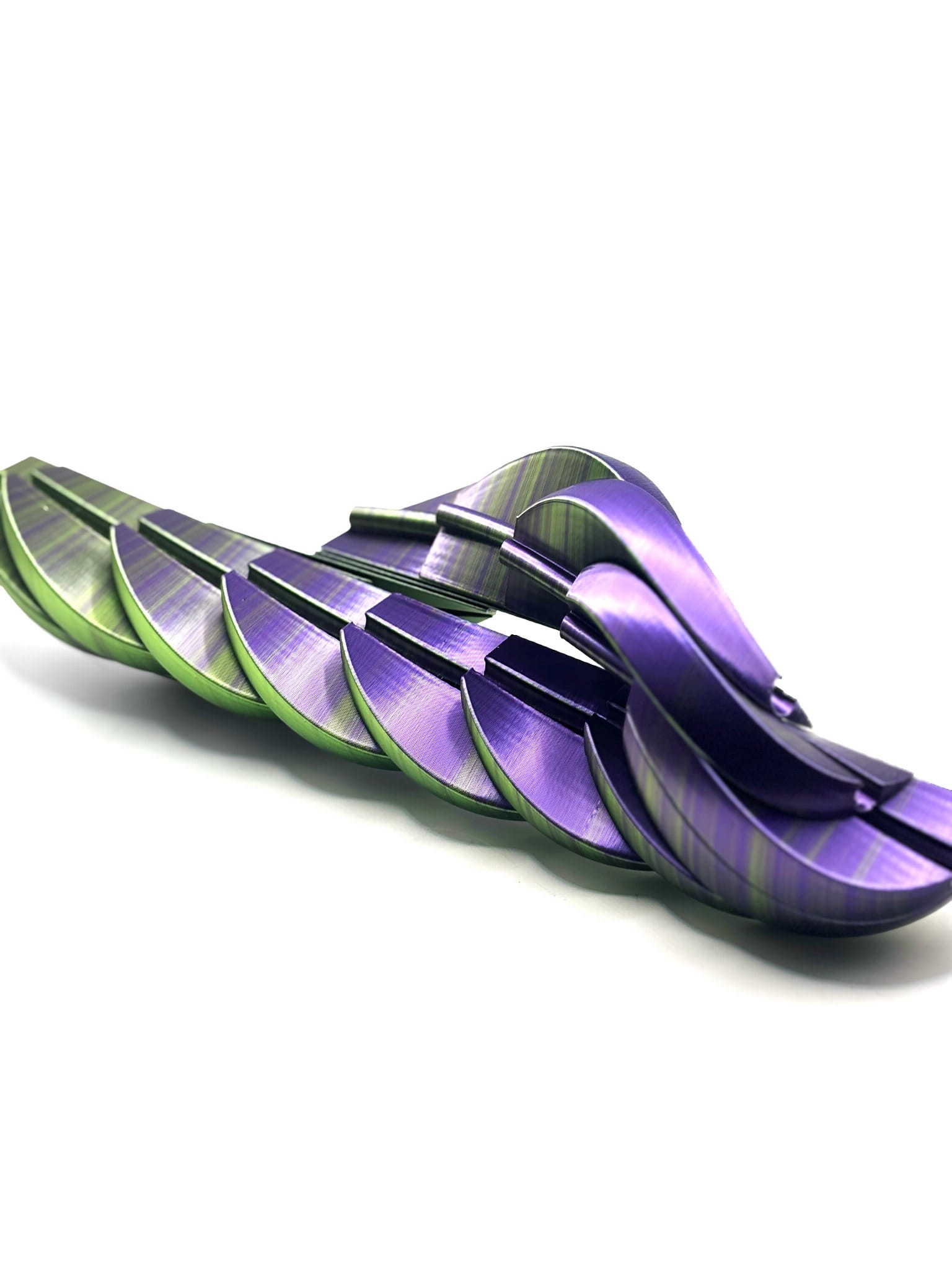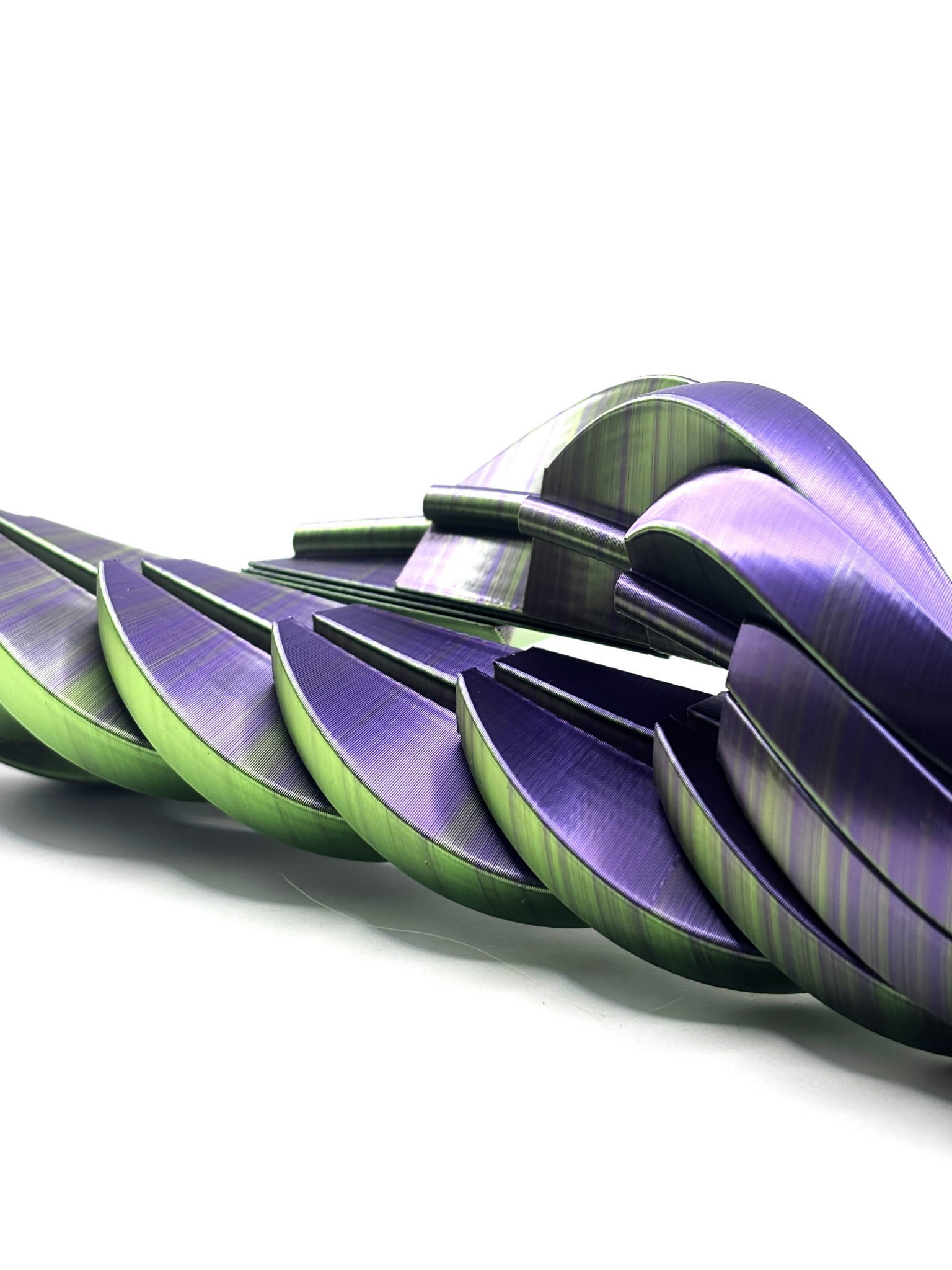 Materiał: PLA (biodegradowalny, pochodzenia roślinnego) Producent filamentu: polski Kolor: różowo - fioletowy - zielony mieniący Technologia druku: FDM Ruchome elementy: tak Przeznaczenie: dekoracja, figurka kolekcjonerska, ekologiczny prezent.